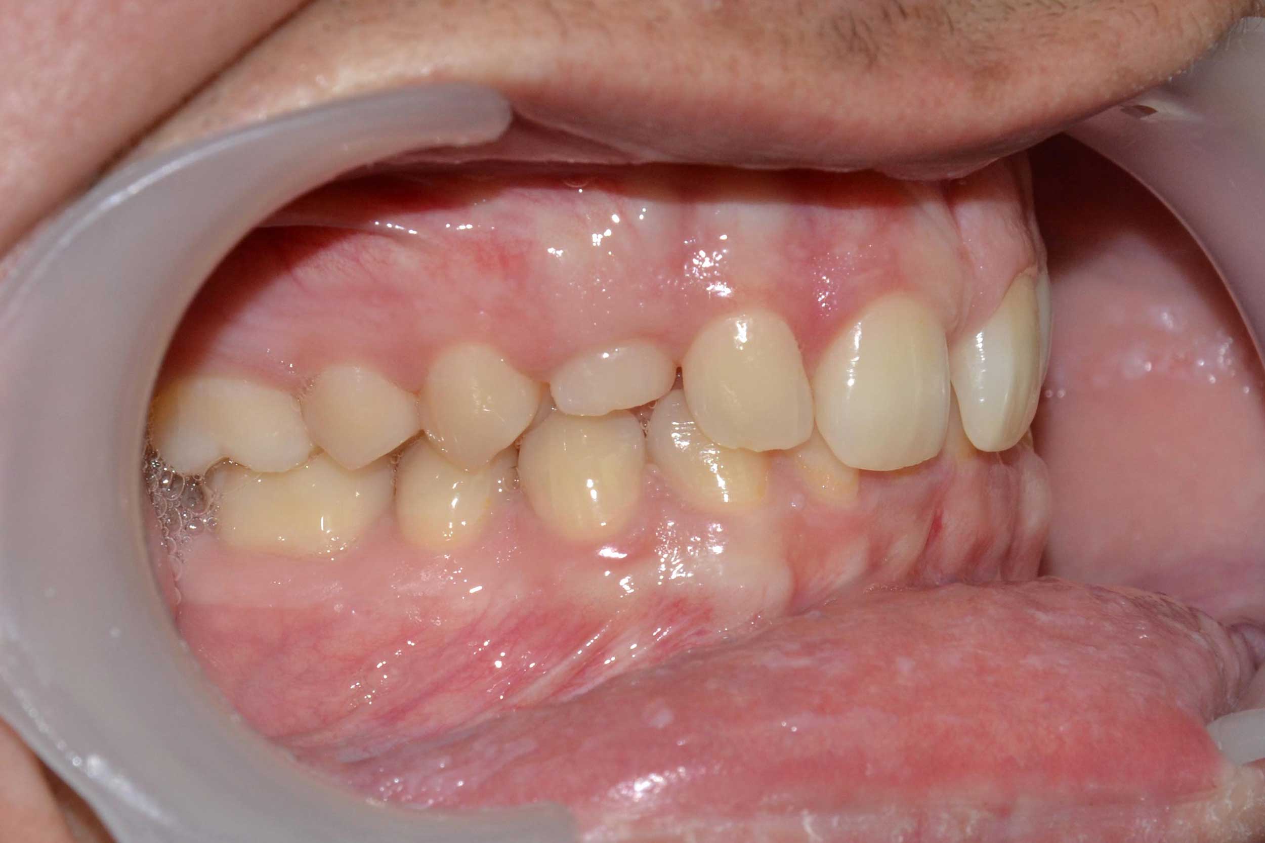 Ádám és édesanyja fogorvosuk javaslatára kerestek fel a felső állcsontban rekedt maradó szemfogak sorbaállításának kérésével. A panoráma röntgenfelvétel elemzése alapján egyértelművé vált, hogy a maradó szemfogak hibás tengelyállása okozta a tej szemfogak perzisztenciáját és a maradó szemfogak előtörésének a hiányát. A szemfogak 30 és 45 fokos dőlésének klinikai képet tovább árnyalták egyéb fogszabályozási eltérések is, mint például a mélyharapás, a nagymetszők közötti rés, illetve jobb oldali második nagyőrlők közötti fordított keresztharapás.